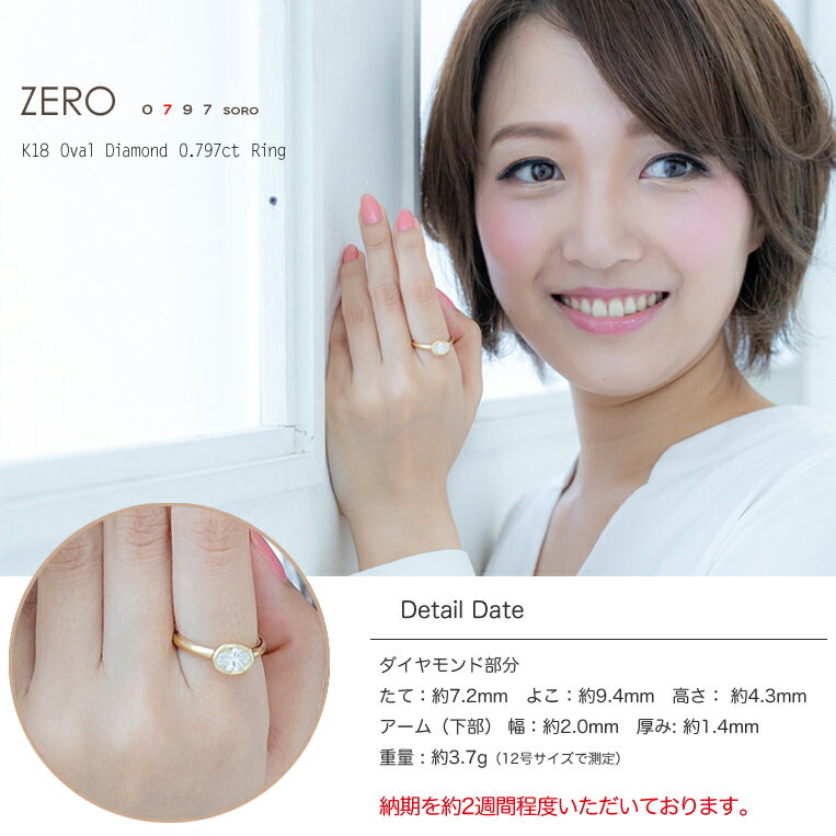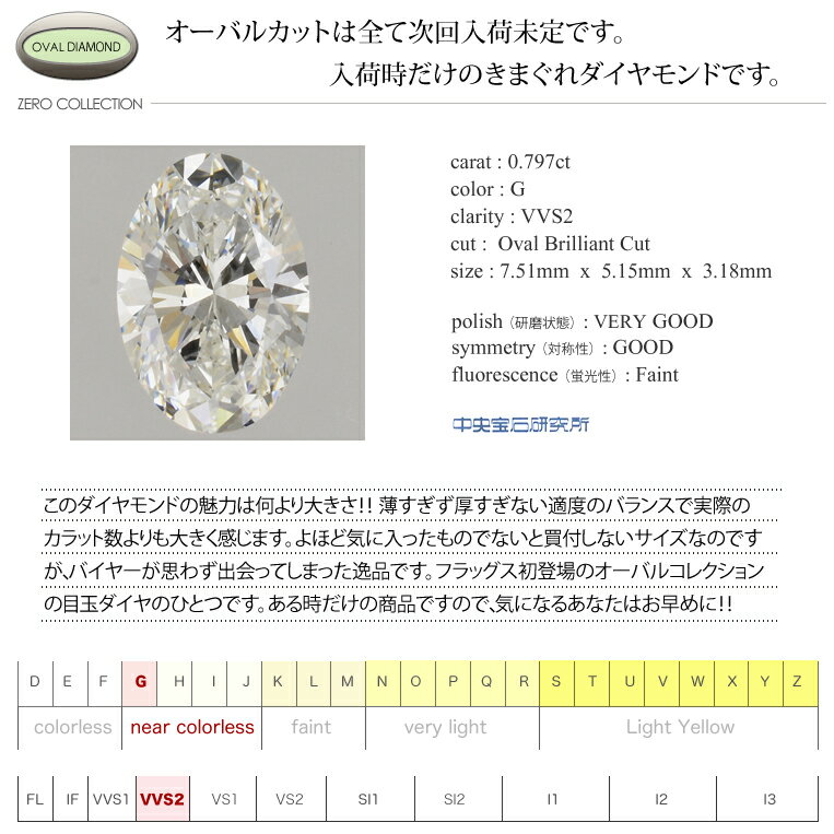 ギフト対応 ◆使用石 ・天然ダイヤモンド 0.797ct ダイヤモンド大きさ:約7.51mm x 5.15mm x 3.18mm ◆ダイヤモンド品質 ・Gカラー ・VVS2クラス ・オーバル ※こちらのダイヤモンドは中央宝石研究所がグレードを証明するソーティングメモは付属されますが、鑑定書は付属しません。