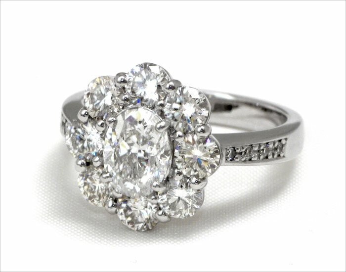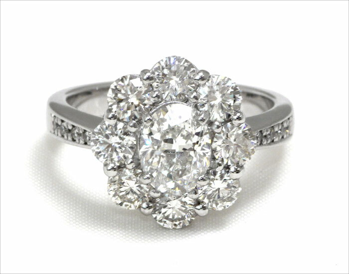 オーバルダイヤの柔らかい女性らしい印象を引き立てながらも パッと目を引く豪華な存在感のあるデザインに仕上がっています。