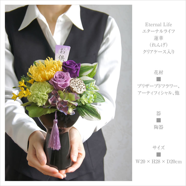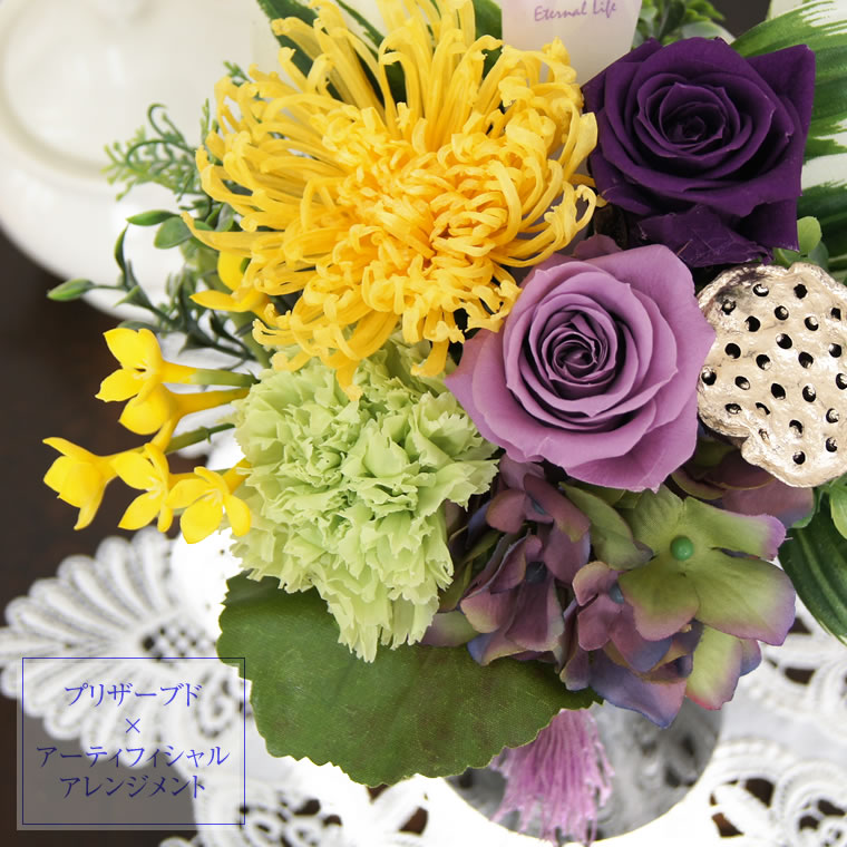 優しく心を慰めてくれるプリザーブドフラワーを使用したアレンジ仏花。