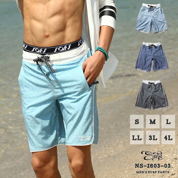 ブランド SAFS 商品名 メンズサーフパンツ ns-2603-03 サイズ サイズ ウエスト 総丈 股上 股下 裾幅 S 66-82 48 29 21.5 28 M 69-84 50 30 22.5 28.5 L 72-88 52 31 23.5 29 LL 75-92 54 32 24.5 29.5 3L 80-98 56 33 25.5 30 4L 84-102 58 34 26.5 30.5 モデルサイズ:188cm・71kg・W75・通常サイズM → 着用M カラー ネイビー サックス グレー 素材 本体:ポリエステル96%・ポリウレタン(スパンデックス)4% ウエスト後ろ部分のみゴムが入っており、紐でウエスト調節可能。